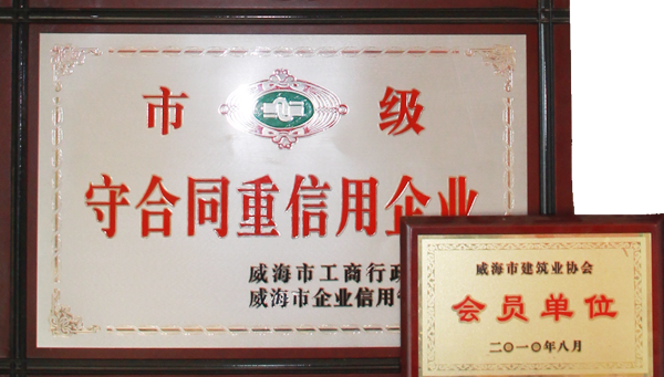 公司連續(xù)八年榮獲威海市“誠信開發(fā)企業(yè)”、“建筑施工誠信企業(yè)”,連續(xù)九年被評為威海市級“守合同重信用企業(yè)”,多次被評為威海市“市級文明單位”、“質量管理先進企業(yè)”、 “安全管理先進企業(yè)”,乳山市“優(yōu)秀企業(yè)”、“先進民營企業(yè)”、“納稅明星企業(yè)”,在社會上逐步樹立了誠信、穩(wěn)健的企業(yè)形象。